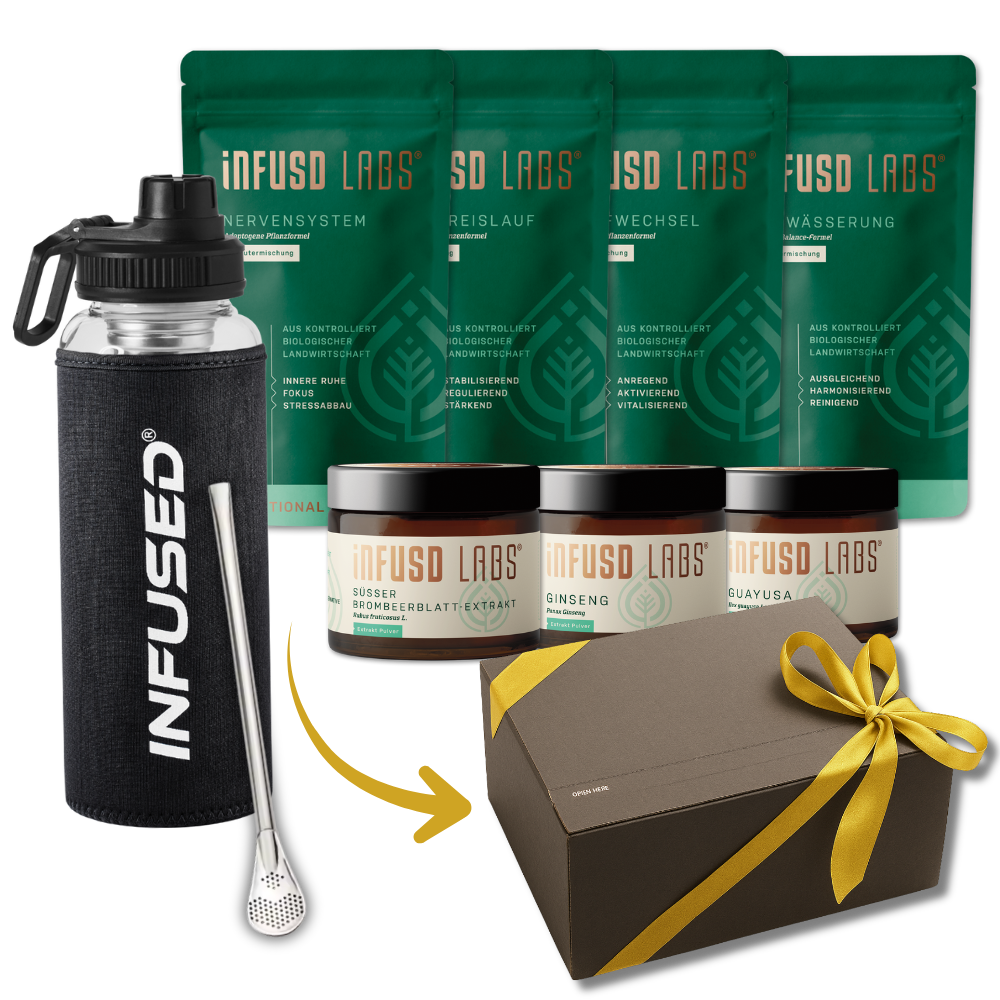 Infused Labs - Entwässerung: Brennnesselblätter*, Birkenblätter*, Löwenzahnblätter*, Hibiskusblüten weiß*, Melissenblätter*.