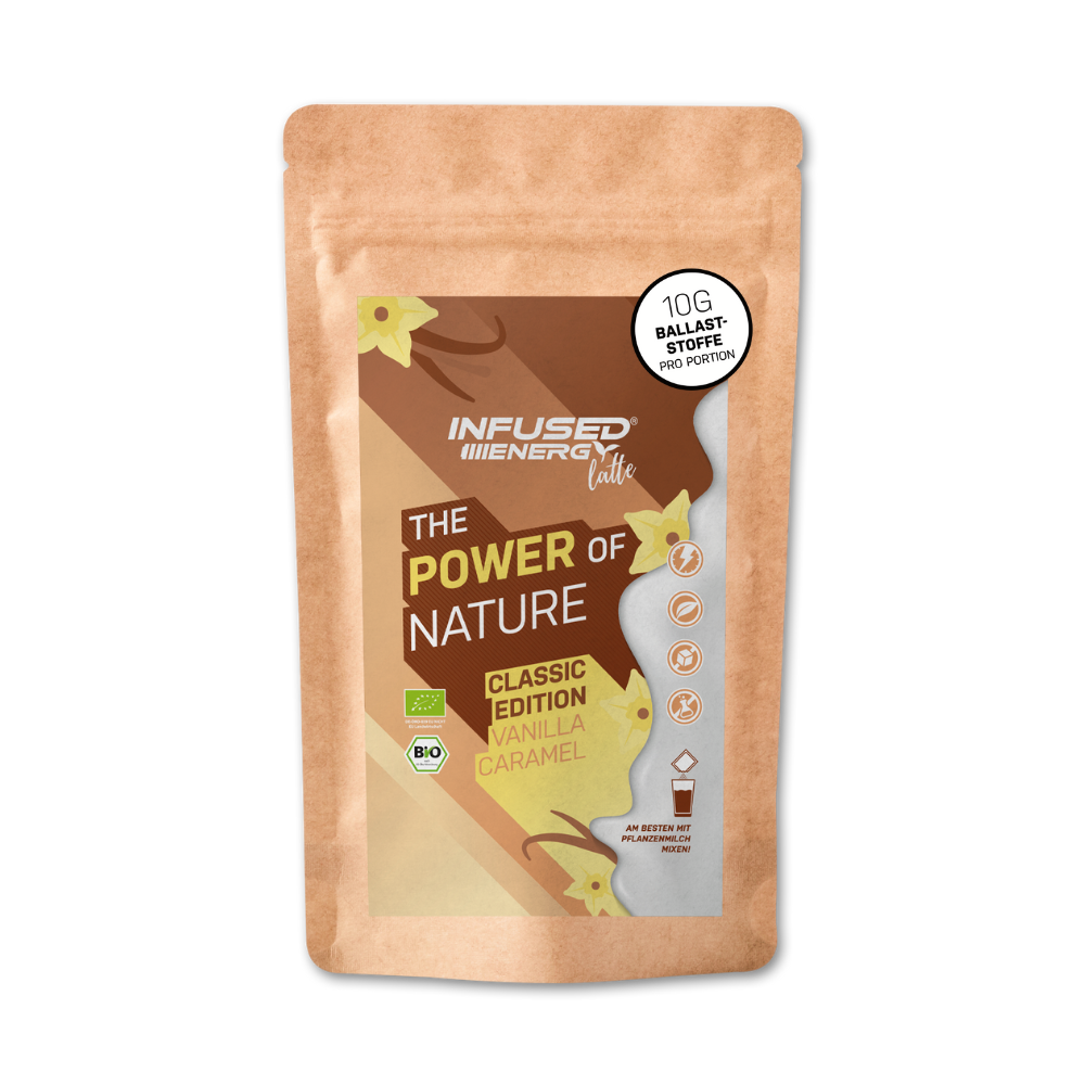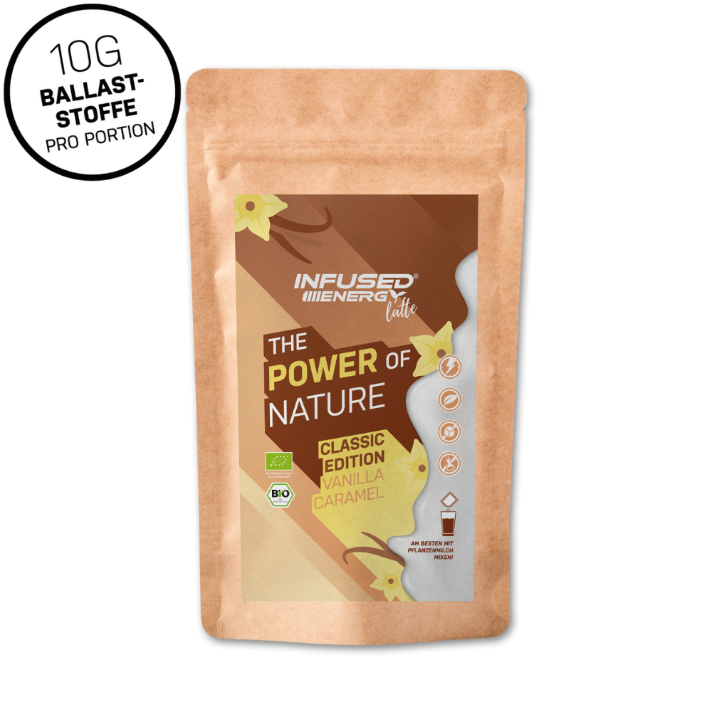 Zutaten: Ballaststoff-Matrix (Akazienfaser, resistentes Dextrin, Chicoréeinulin, Guarkernmehl, Grüne Bananenfasern*), gemahlene Datteln*, Japan Matcha*, natürliches Vanillearoma, natürliches Karamellaroma, Ashwagandha*, Guarana, Ginseng, Guarkernmehl*, Bourbon Vanille*.